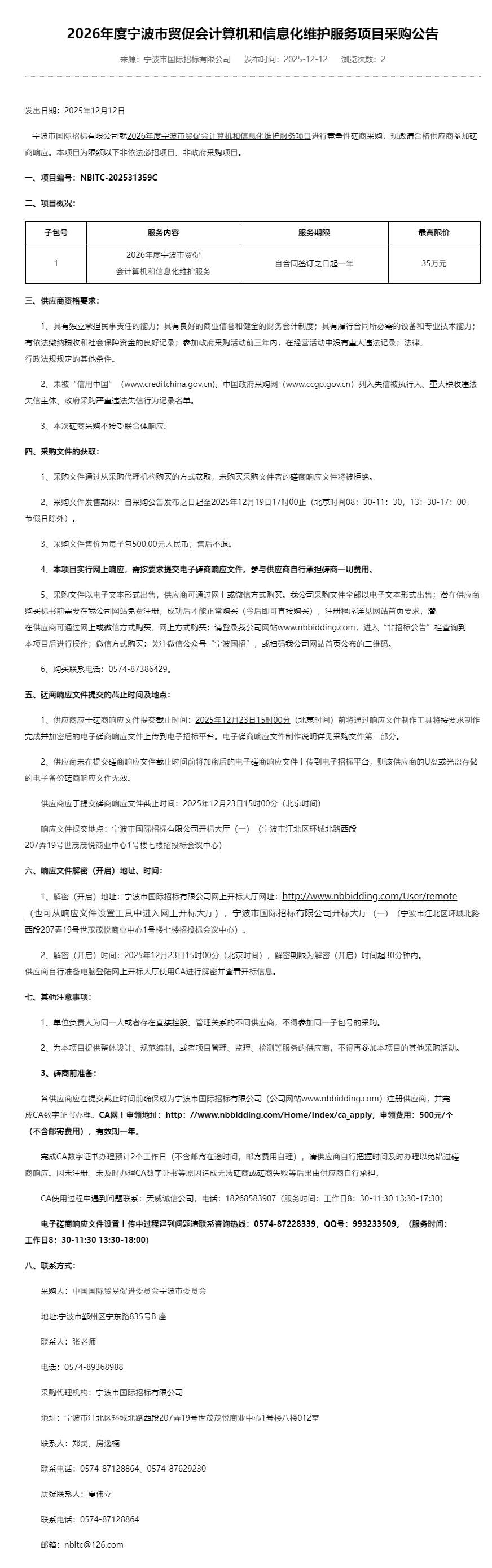 2026年度宁波市贸促会计算机和信息化维护服务项目采购公告