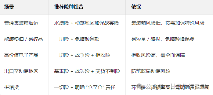 不同货物、运输方式和目的地,适合的险种组合也不同,参考以下方案: